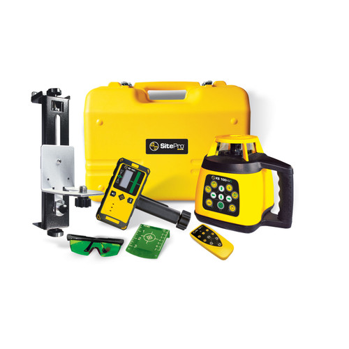 SitePro's KS 100HVG horizontal/vertical electronic self-leveling green beam rotary laser for precise leveling applications. Ideal for indoor and outdoor use. Enclosed Rotor Housing keeps laser safe from tough jobsite conditions.